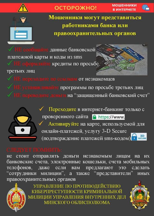 В рамках проводимой на территории Пуховичского района в период с 23 по 27 марта профилактической акции МВД «Неделя кибербезопасности» Пуховичский РОВД предлагает ознакомиться с профилактическими материалами об актуальных способах интернет-мошенничества и киберпреступлений.
